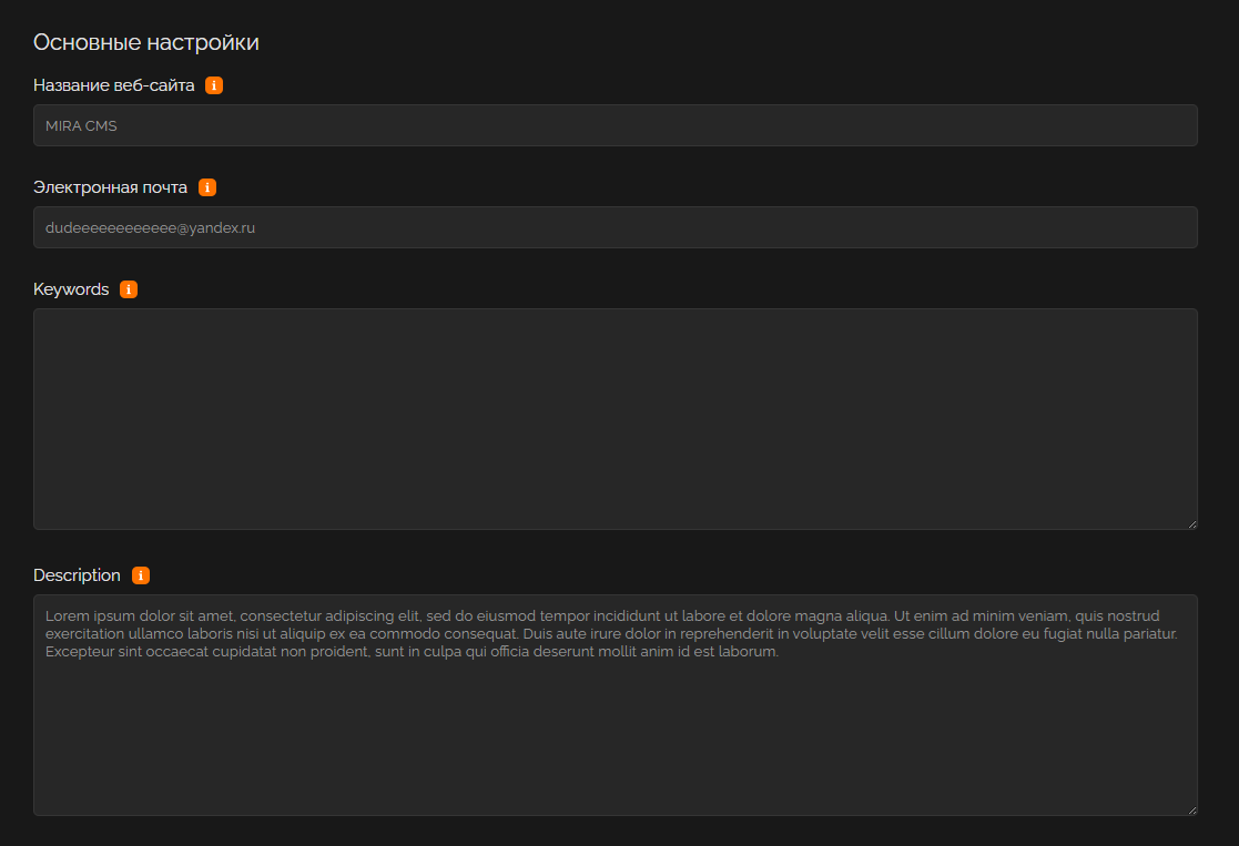 Раздел «Настройки сайта» позволяет конфигурировать базовые параметры ресурса.