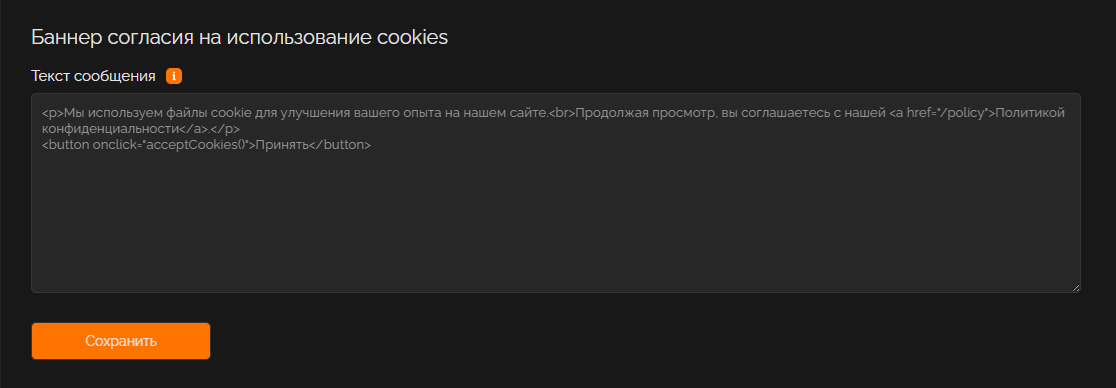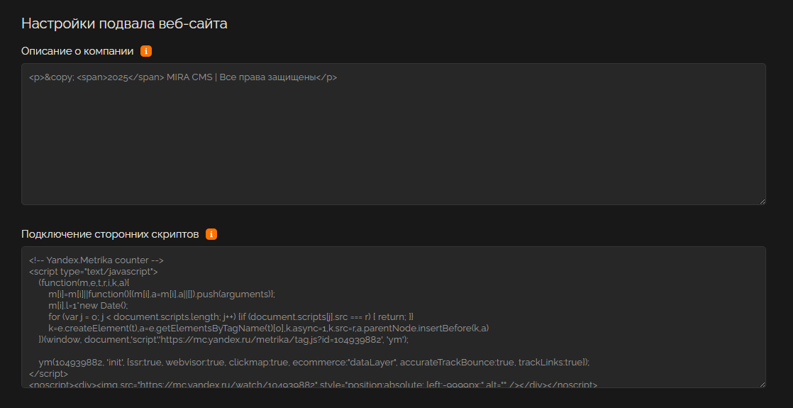 - Подключение сторонних скриптов — поле для вставки кода (например, счётчики аналитики, виджеты соцсетей).